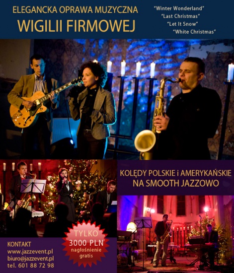 Zbliżające się Święta Bożego Narodzenia to dobra okazja, aby zachęcić firmy do organizacji wigilijnej kolacji dla pracowników lub kluczowych klientów, połączonej z koncertem kolęd / wspólnym kolędowaniem / z delikatną muzyką smooth jazzową wprowadzającą miłą artmosferę.